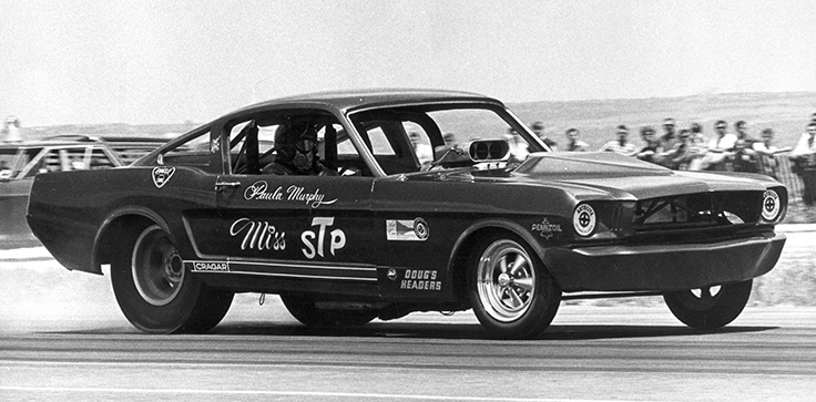 Bynum built the chassis and the 392 engine that sat beneath a Mustang body. The Mustang ran low-eight-second passes through 1967, and Murphy found herself a popular draw with track operators all eager to see the “lady racer.”