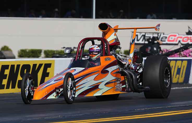 In Super Comp, former Super Gas champ John Labbous Jr. is the leader in the clubhouse with 677 points, the result of a season that has included three wins and a runner-up finish while driving for team owner Anthony Bertozzi. Labbous cannot improve his score and must fend off a challenge from Tanner Theobald, who can earn points at both of the remaining events.