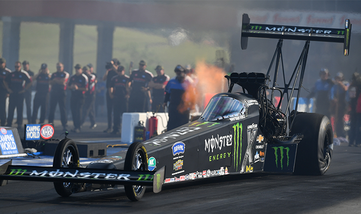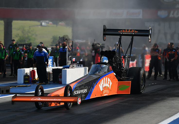 On the other side of the ladder, Tony Schumacher and his SCAG Power Equipment Top Fueler defeated Shawn Langdon, 3.79 to 3.84, to earn a bye run into the semis, and Leah Pruett scored a round win over Doug Kalitta in her Rush Truck Centers dragster while also nabbing the provisional pole on a stout 3.74. She'll race Scrappers Racing pilot Mike Salinas, who was tardy at the tree (.177) but overcame Clay Millican's pass with a strong 3.76.