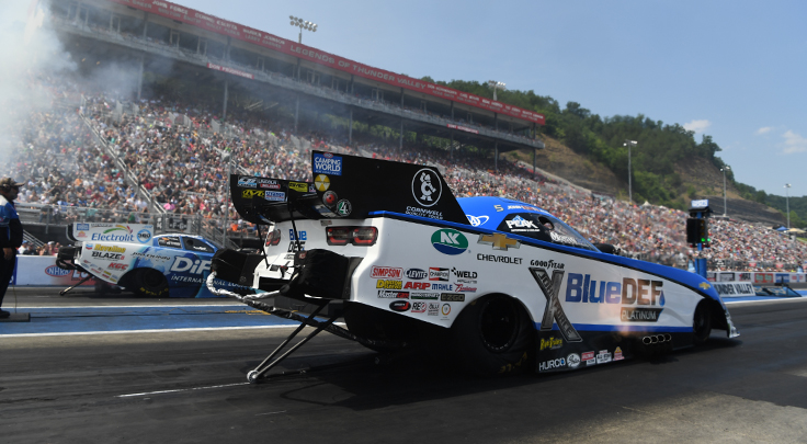 In Funny Car, Epping No. 1 qualifier Chad Green took a single when Jim Campbell was unable to make the event, and the Bond-Coat Mustang driver will get the second-round bye run and a smooth path to the semifinals. Bob Tasca III and his PPG Ford defeated reigning world champion Ron Capps on a holeshot, 3.97 to 3.96, and AAA/Cornwell Tools-backed Robert Hight thundered to the Bristol pole while also powering past Alexis DeJoria, 3.93 to 3.99.