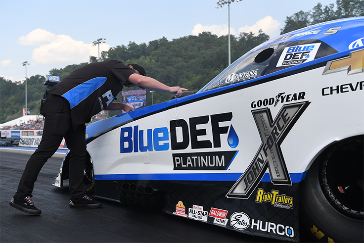 John Force lines up next to the 150th different opponent of his career, and although Alex Laughlin and his DiPinto-branded machine are right there as they leave the starting line, he gets close to the wall and slows, and Force pulls steadily ahead in his Peak Chevrolet to win on a 4.09 to 5.20. Force will be racing in his fourth consecutive round of the season.