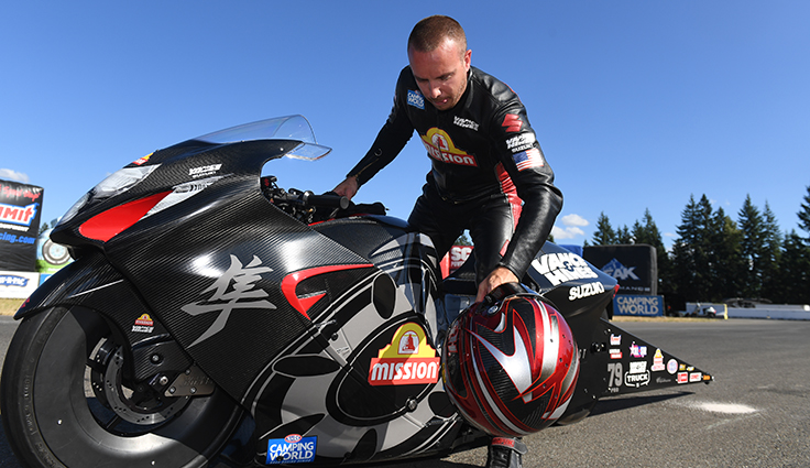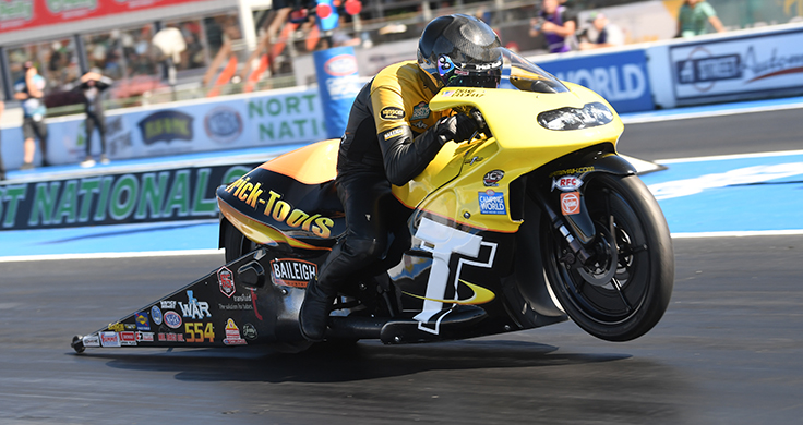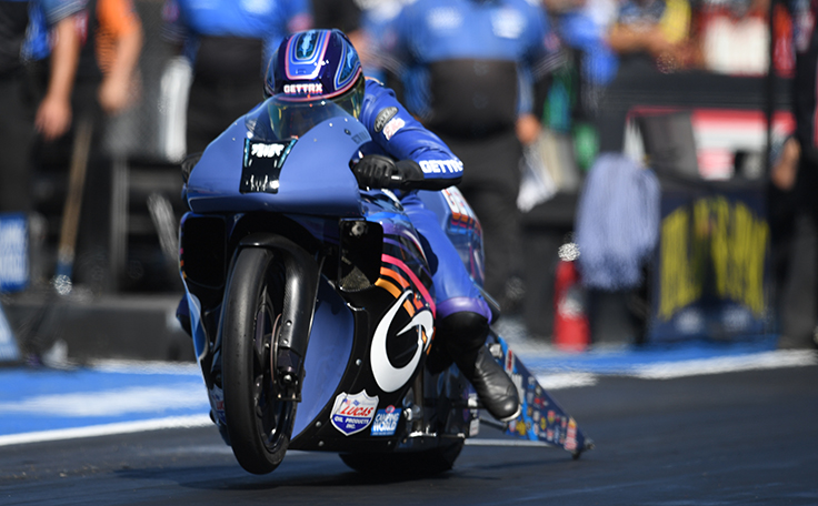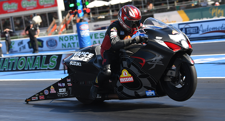 After three straight second-round losses, Eddie Krawiec is back in the semifinals with the Vance & Hines/Mission Suzuki after taking down rookie Chase Van Sant on a 6.82 to 6.86 decision. Matt Smith defeated wife Angie in their first matchup of the season, racing to a 6.81 to beat Angie’s 6.86 and earn semifinal lane choice over Krawiec.
