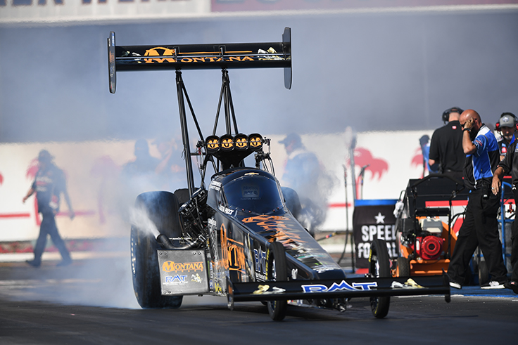Antron Brown reset low e.t. in his first-round victory over tire-smoking Doug Kalitta. Brown’s Matco dragster ran 3.73 and 3.75 in qualifying but picked up a ton in Sunday’s cool air with a 3.690.