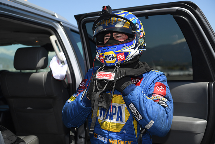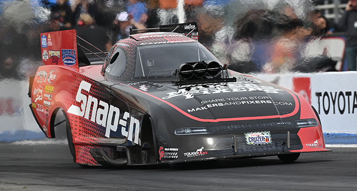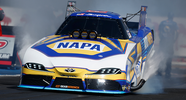 In a rematch of their final-round race at last year’s season finale, Ron Capps reversed the outcome against low qualifier Cruz Pedregon, who got loose and crossed the centerline. Bob Tasca III matched Capps' 3.997 pass, but Capps' faster speed, 324.44 to 321.88, will give Capps lane choice,