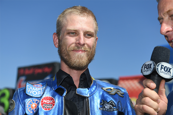 A feel-good opening round for Cory Reed, who claims his first win light since returning to Pro Stock Motorcycle after two years and 10 surgeries following a two-bike wreck in Charlotte with teammate Joey Gladstone. He's riding Gladstone's motorcycle here for Reed Motorsports and J&A Service.