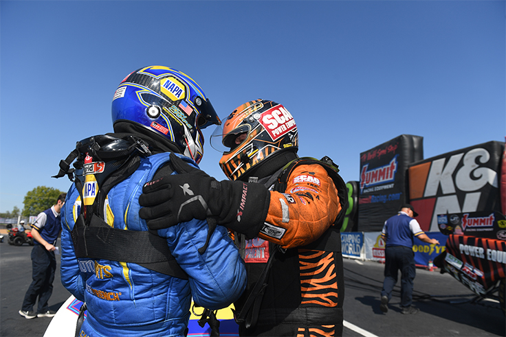 They were tied at No. 3 in the points entering today's action, and with round wins, both Ron Capps and Matt Hagan keep their names in the game. Hagan drives the American Rebel Dodge Charger to a win over Alexis DeJoria, who was No. 7 in the points before the day began, while Capps knocks out Tim Wilkerson – who was No. 6 in the points – by just .004-second.