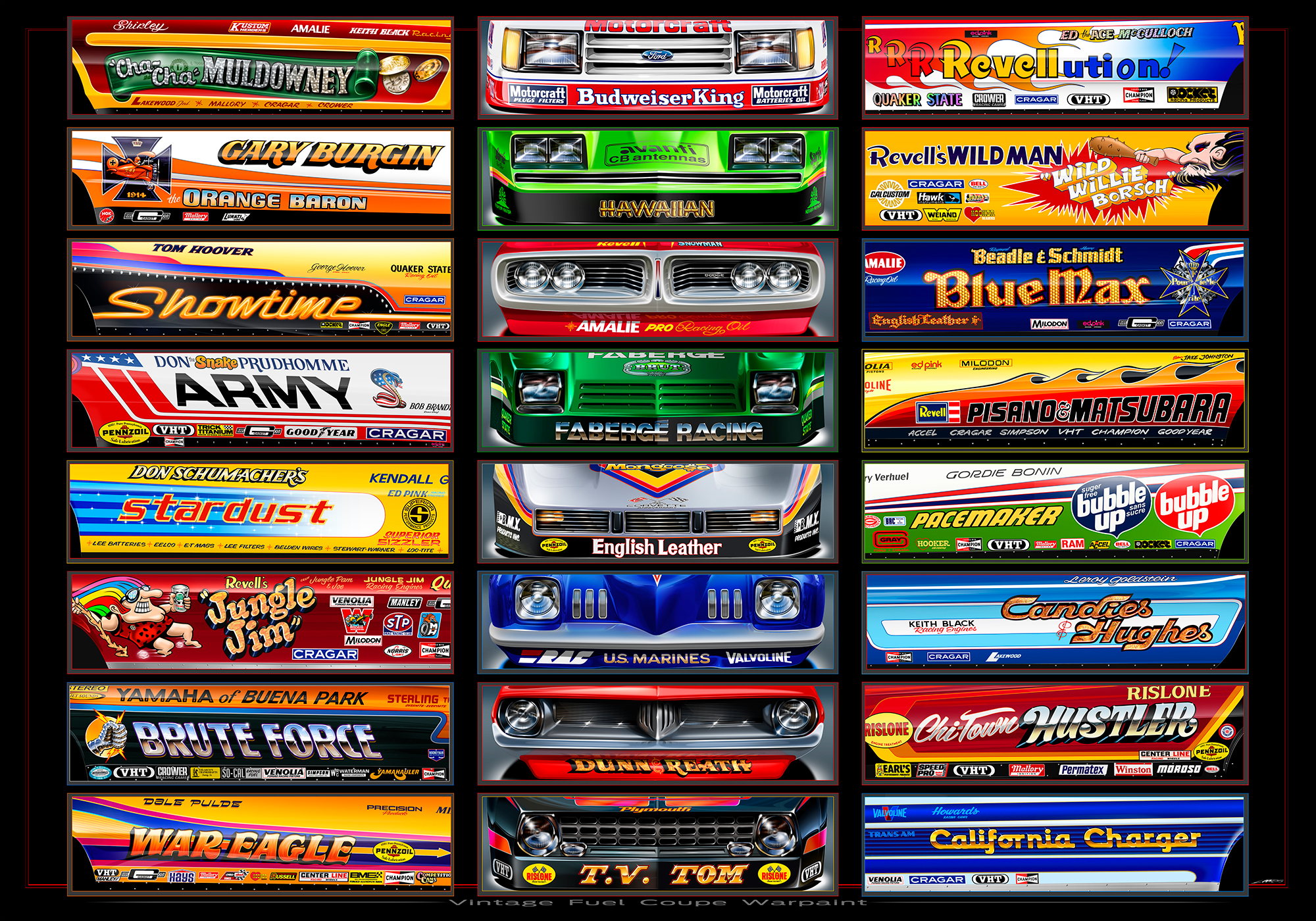 Today’s fans don’t have the same access to those blasted body parts, but Swedish artist Lars “Loors” Svensson has maybe the next best thing with his cool 1970s Funny Car poster that faithfully shows the flanks and noses of 24 recognizable floppers of the era. He calls it Vintage Fuel Coupe Warpaint.