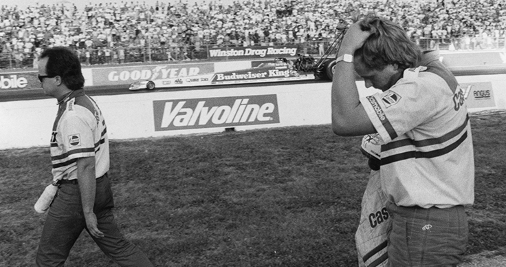 Walt bought the Top Fuel team, and Pat effortlessly licensed in the car with 5.0s runs in Seattle, and the team brought the car to the world’s biggest drag race, the U.S. Nationals. Running both the Alcohol Funny Car and Top Fueler, Pat incredibly reached both final rounds. He had stunned everyone during Top Fuel qualifying with near-perfect reaction times and was actually a bit of a favorite to beat Kenny Bernstein in the Top Fuel final, which came not long after Pat had won the Alcohol Funny Car race title. But things went wrong on the burnout.