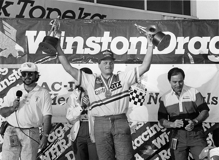 The tires grabbed unexpectedly, and the nitro newbie tried to continue the burnout, but the blower backfired and that was that. He had to disconsolately watch Bernstein smoke the tires on his final-round solo, but weeks later, he won in both classes at the NHRA national event in Topeka to become the first driver to win in two classes at the same event, a feat he would repeat early the next season in Phoenix.