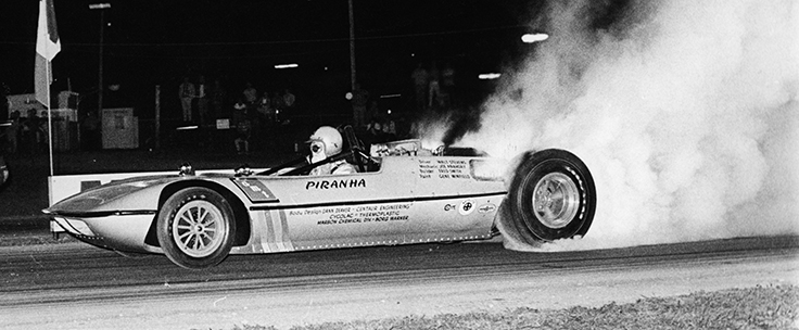 In 1966, Stevens took over the wheel of a strange little hybrid, the AMT Piranha, a rear-engined plastics showcase of a wedge Top Fueler.