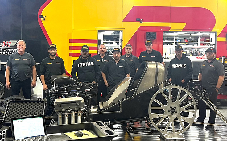 DHL Funny Car team members with their just-repaired primary car, from left, crew chief Todd Smith, crew members Isaiah Taylor, Jaime Gandara, Chris Forton, Tanner Meyer, James Couture, Jacob Wilder, Mike Morris, and Matt Mays.