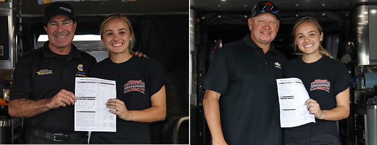 The qualifications to upgrade her Top Dragster competition license were one half-track run and two full quarter-mile runs at six seconds or quicker and 205 mph or faster. Maddi’s licensing runs in order: half-track: 5.664 at 215 mph; first full: 5.506 at 266 mph; second full: 5.533 at 265 mph. After the completion of her second full pass, she was officially a licensed Top Alcohol Funny Car driver. Maddi completed her paperwork and had a star-studded group of drivers that were in attendance to sign off on her runs; the qualification is two signatures per run from an individual that possesses a Top Alcohol Funny Car competition license or higher as well as one signature from a track official for each run.
