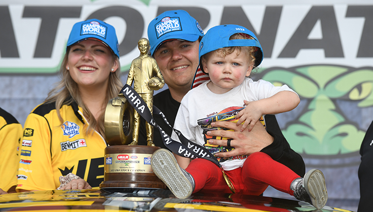 Finally, racing in good guy white will be James Alexander, the son of Funny Car driver Blake Alexander and his wife, Leah, who, as a Charlotte resident, may have the home-field advantage. James stays lean-and-mean by snacking on berries and, when he’s not watching Daniel Tiger on TV, keeps fit with walks in the park.