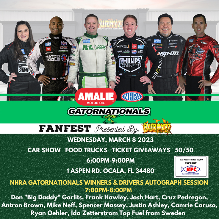 “We are excited to host this kick-off event with the NHRA to start the Gatornationals,” said Hart. “Our goal is to have as many former Gatornationals winners and current drivers as possible for the free autograph session and to continue to grow this event to highlight the Gatornationals. This is one of the most historic motorsports events in the country, and we are excited to have it in our backyard and celebrate with everyone from Ocala and around central Florida. I want to thank everyone at Burnyzz Speed Shop for supporting this great first-time event.”