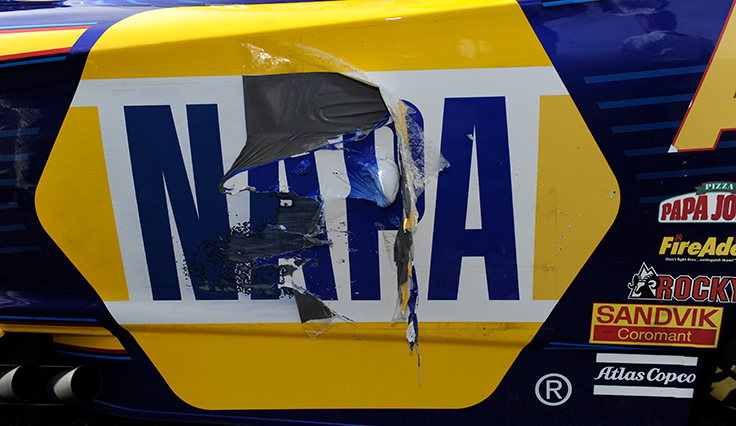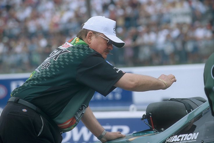 "You have to remember that at the time, [crew chief Rahn] Tobler was still running the five-disc clutch,” he remembered. “He had looked back at his notes from the year before when we were just so underpowered, and he just threw everything at it the first lap on Friday afternoon, and we set a track record [3.84 at just 329 mph]; it already hauled ass that first run because he just tried to lock up the clutch as soon as he could. It was literally pulling the front end off the ground when the clutch locked up, and I was just hanging on to it.