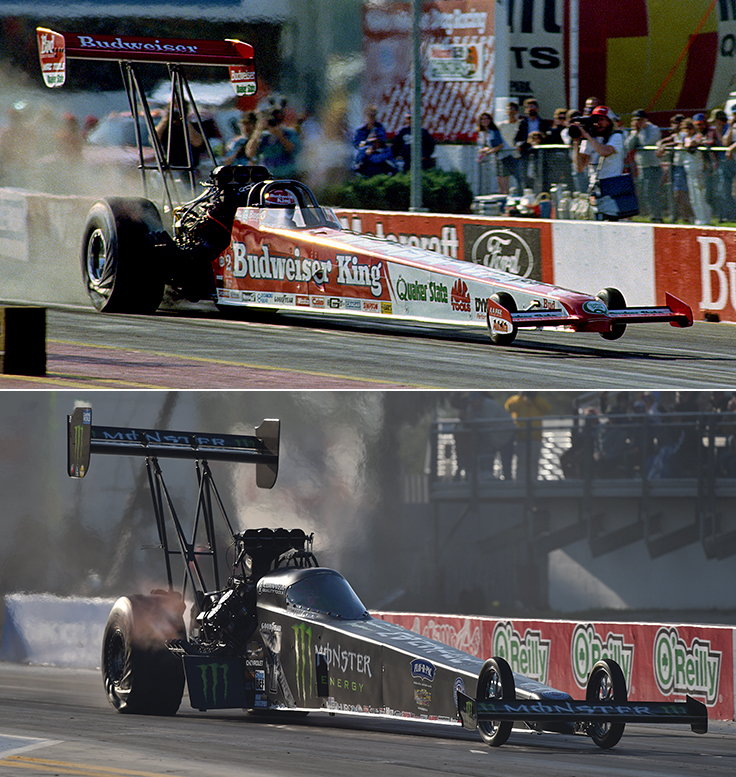 And, of course, there's the aerodynamic factor. It took Top Fuel cars nine years to go from the first 250-mph pass (Don Garlits, 1975 World Finals) to the first 260 (Joe Amato, 1984 Gatornationals), with the most obvious change there being the introduction of the tall rear wing on Amato’s car that reduced drag while maintaining downforce.