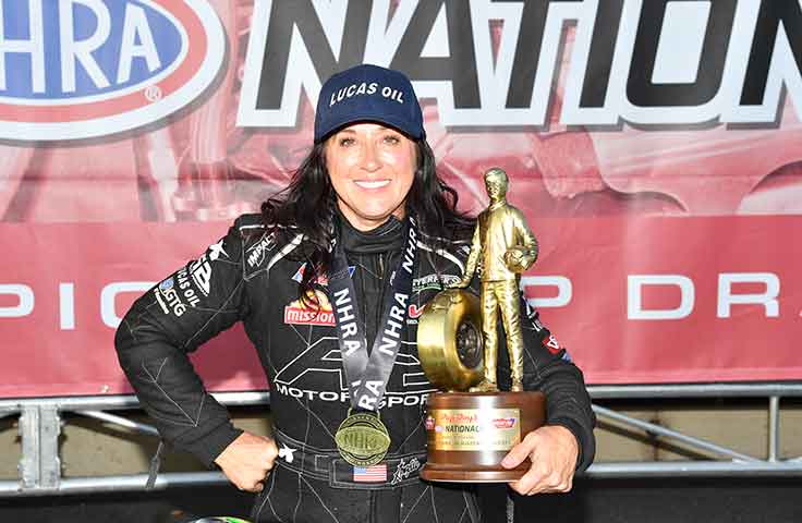 Until recently, Angelle Sampey was known as one of the Pro Stock Motorcycle classes all-time greats with three championships and 46 victories. Sampey isn’t afraid to admit that even she was skeptical when Top Fuel champ Antron Brown approached her about a move to four wheels. It may not have been the smoothest transition, but Sampey achieved a major milestone this season when she won the Pep Boys NHRA Nationals in Reading.