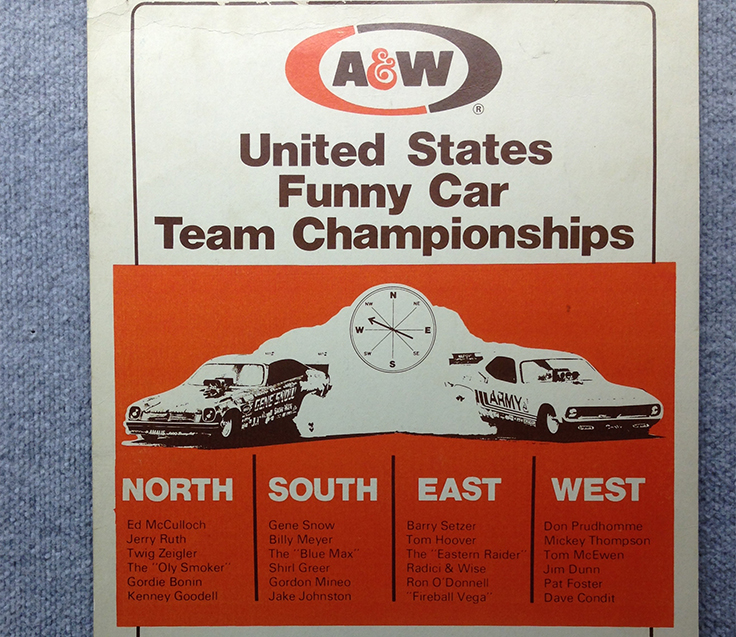 The West team won the highly touted A&W Root Beer-sponsored United States Funny Car Team Championships at Irwindale Raceway, which featured six drivers from the four compass points competing in three rounds for total points. The West finished with 13 wins, just ahead of the East's nine.
