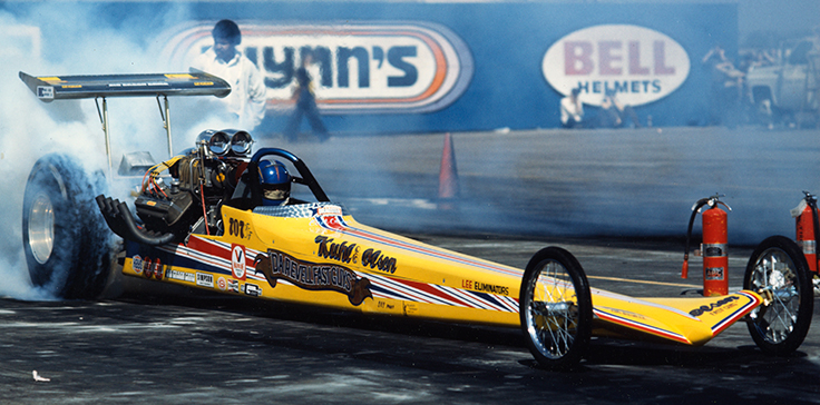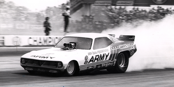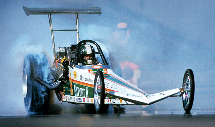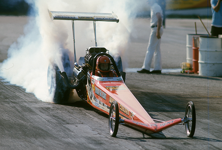 Although Prudhomme was credited with a questionable 6.01 during a match race at Lebanon Valley Raceway in New York in August, the best run at an NHRA national event was 6.161 by Dale Pulde in Mickey Thompson’s Grand Am, a run recorded in round two at Ontario with, ironically, Prudhomme losing in the other lane. Pulde also set top speed of the season, 233.76 mph, in the next round in Ontario but lost on a wild semifinal holeshot to eventual event winner Dave Condit, 6.177 to 6.191, in what was then the quickest side-by-side race in Funny Car history.