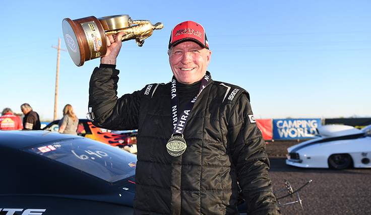 Firestone’s support system begins with his family, including wife Cathy, son Kyle, daughter Ashley Hoggard and her husband, Jimmy, and “everyone who’s ever pulled me up to the line or handed me a wrench.” He also thanked Patterson/Elite, RJ Race Cars, Mickey Thompson, JEGS, NGK, Abruzzi Converters, and Comp Cams.