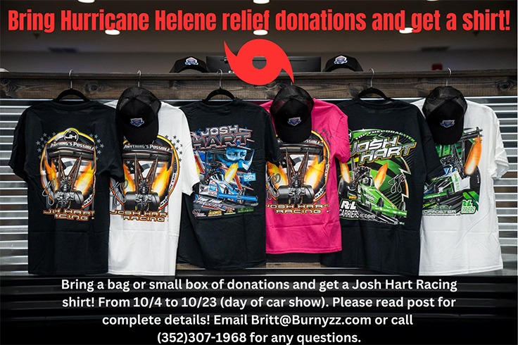 The Harts and Burnyzz Speed Shop will be collecting donations from now until Oct. 23. They are encouraging anyone to bring a bag or small box of donations, and in return for this act of generosity, fans will receive a Josh Hart Racing shirt (while supplies last). Donations can be dropped off at Burnyzz Speed Shop (1 Aspen Road, Ocala, FL, Monday-Friday 9 a.m.-5 p.m). The Harts are going to match every donation.