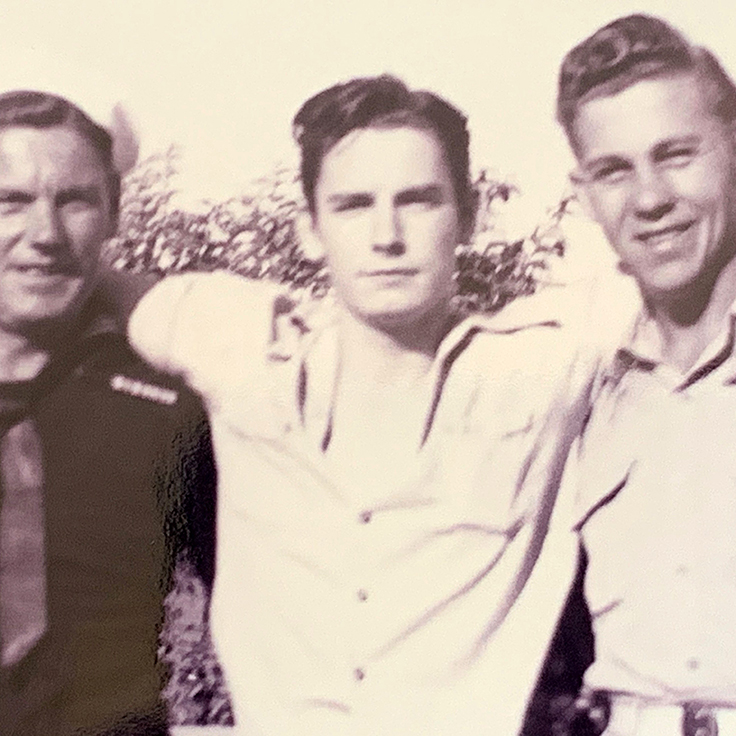 “That’s Dad in the middle, Everett on the left, and Lloyd on the right. This is about 1944 when Everett was in the service in World War II — he was an underwater welder — and they’re holding up our dad, who is in a full-body cast after a motorcycle accident. He was 16 in this photo.”