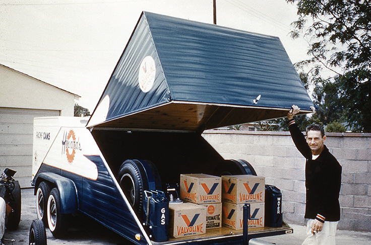 “The trailer would lift up on hinges at both ends, to put the car in and to access your parts. He got a big sponsorship from Valvoline, and they paid him $500 a year, and they painted the trailer for him. You can see you’ve got your oil in there, some kind of gas, and a set of rear tires.”