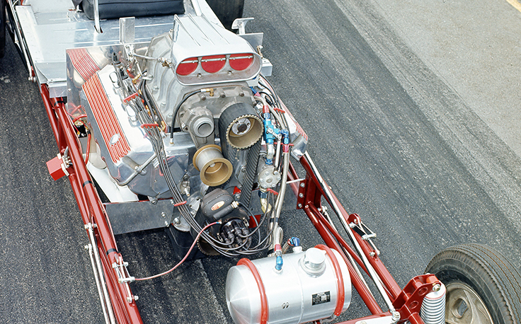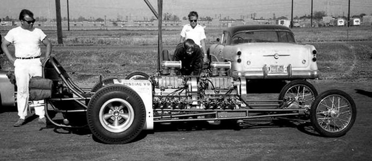 “Here’s the twin-engined car. The motor in the front is a Pontiac, and the one in the back is a Buick. You can see that the valve covers are different. They both have little 4-71 blowers on them.