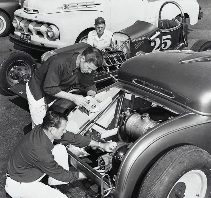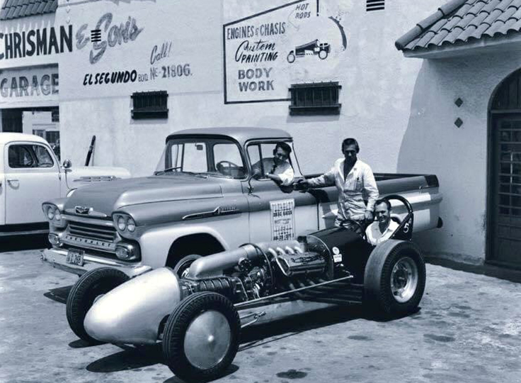 This is the Chrisman & Sons garage in Compton, Calif., that Everett owned and where his sons, Art and Lloyd, worked. That’s the famed Hustler dragster in its early days.