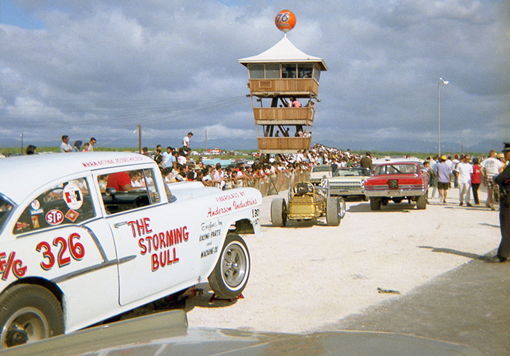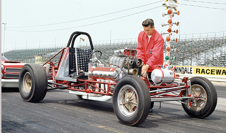“This is the 1967 car. They finally got better tires on them, that's when they started hauling ass. The fast guys were injected in '66 and '67, and then the blown cars were running like eight-flat, 8.10. When my dad went to Indy in '67, Marvin Rifchin [of M&H Tires] asked my dad if he would put his new tires on the car. My dad had a deal through the factory for Goodyear, but Marvin had always been good to him, so he put them on, and he went from like an 8.05 or something to 7.60. After that, you couldn’t believe how long the line was at the M&H tent. The wheelie bars are old leaf springs turned upside down with casters on them.”