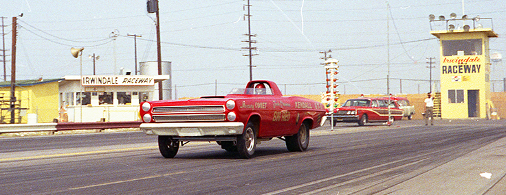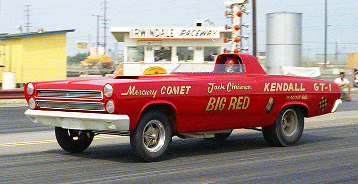 “So, in 1966, Dad got one of the first flip-top Mercury Comets. Don Nicholson got the first one, but his had a roof on it. Dad’s didn’t. When the car first came out, it wasn't in public yet, and Kendall Oil was the sponsor, and they called the car ‘Big Red,’ but then they found out later that Pure Oil or somebody had Big Red, so they had to take it off and had it lettered GT-1. This is Irwindale Raceway with that famous old hamburger stand.