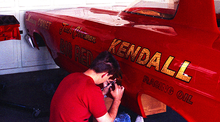 “Tom Kelly lettered the car at our house, and then he had to come back and take Big Red off of it, and he put GT one on the side. Tom was THE guy if you wanted a letterer. When some guys did the gold leaf, they used a cotton ball and twisted them to get a little to get the curlicue effect. Tom used to use a piece of velvet.”