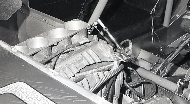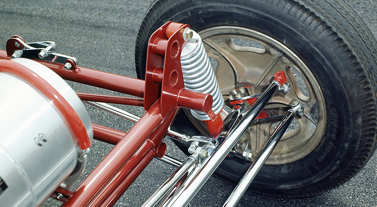 “On the first Logghe cars, the shock towers are welded. In 1967, they changed to an adjustable shock tower so you could move it up and down. That latch right above the fuel tank was how you locked the body down. The latch would grab something on the bulkhead, and then you pull the handle down, and that lets the body down. And then there's a bolt and a nut that you screw it on to the bulkhead. You had [to] reach inside where the car was running and latch it down and then put a bolt and nut on it. You started them with a body down because he didn't have blower starter yet, just starters on the flywheel that you plugged into a battery.”
