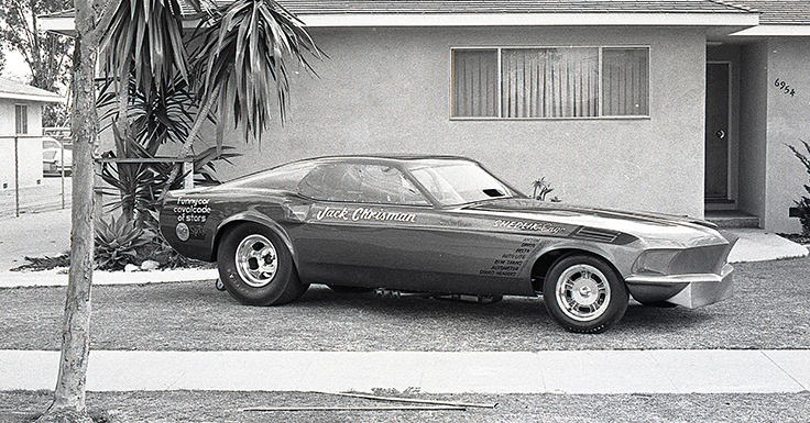 “That is Lions Dragstrip at the end of 1969 with the Mustang.. We just got off a tour with the Coke circuit [Coca-Cola Cavalcade of Stars] and had a big blower explosion and blew the roof off. You can see C.J. Hart at far right. My dad was the captain of the Coke circuit the first year, and there were eight guys on tour, and they raced each other like 40 times that year. He had just sold this car to Frank Oglesby, and then Frank called and said, 'I'm almost there; how does my car look?' Dad was like, 'Well, you're not gonna like it. We’ve got to do a little bodywork.' So, he took over to Marv Eldridge, and they put a new top on it."