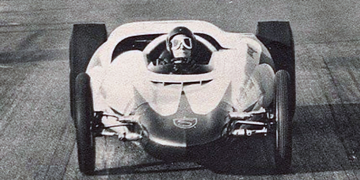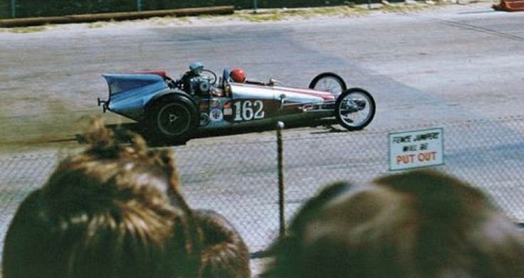 “This is the third sidewinder. The engine was laid over at a 45-degree angle and covered by the body. The whole chassis was magnesium. The side panels were all mag, but the front nose was aluminum because they didn't have the mag they could shape like that. Kent Fuller built the chassis, and I think Wayne Ewing [had] done the body. It didn't run very good because it has a weird Volkswagen front suspension on it and it wouldn't handle.”