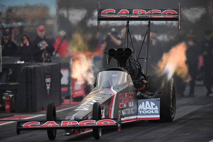 World champ Doug Kalitta, flying the colors of SealMaster this weekend, seizes the No. 1 spot with a 3.69 but it costs him a blower and injector with a finish-line backfire, but he doesn’t hold it long either as Steve Torrence rips to a 3.678.