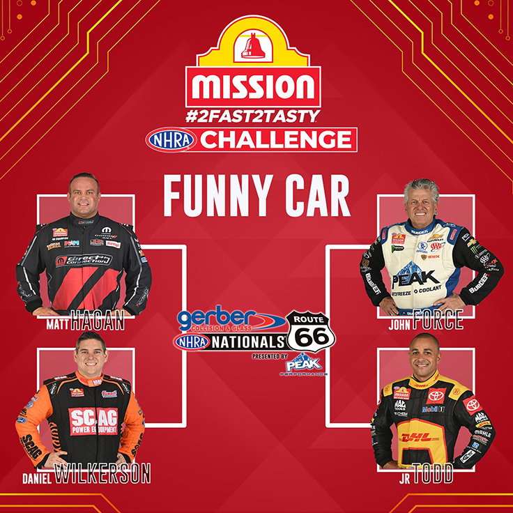 The Mission Foods #2Fast2Tasty Challenge in Top Fuel will feature the final quad from the recent 4 Wide NHRA Nationals in Charlotte including winner Justin Ashley, world champ Doug Kalitta, Antron Brown and Clay Millican, the defending Route 66 winner.