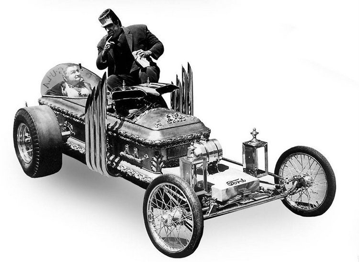 During this time, he also did some television and film stunt driving. According to his son Chris, Southern was the driver who spun the dragster out at Pomona Raceway in the 1964 movie Bikini Beach, and that he also drove the Dragula coffin-shaped dragster that was featured in the “Hot Rod Herman” episode of the Munsters television show in 1965. I don't think he drove it for that episode (at least according to the episode credits), but the car did make exhibition runs elsewhere.
