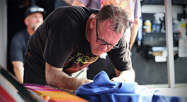 Jason Line working on the 426 Hemi in Bucky Hess's Fishstick Hemi Challenge Super Stocker.