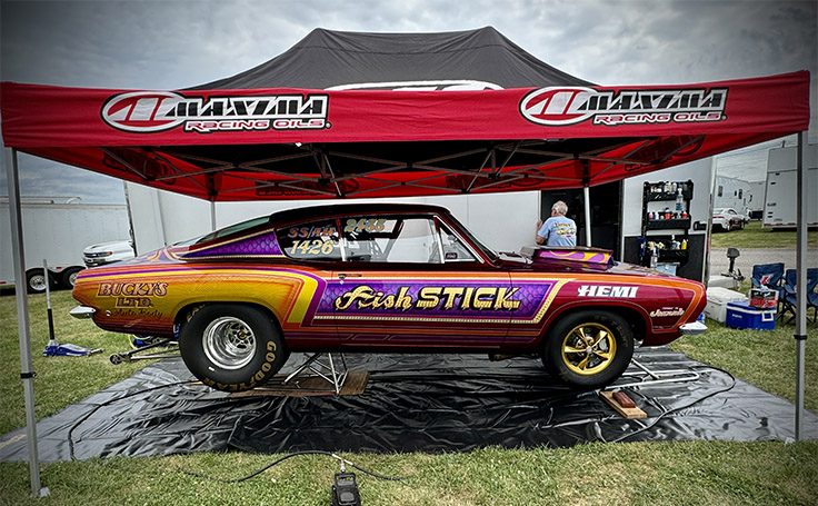 As is true for every car in the Hess Hemi Drag Racing Team stable, the classic 'Cuda features a fantastic and outlandish hand-crafted design by custom painter Travis "Tuki" Hess, Bucky's son. Each of the radical Hemi-powered cars also has a moniker, and the one Line is driving uniquely and affectionately known as "Fish Stick."