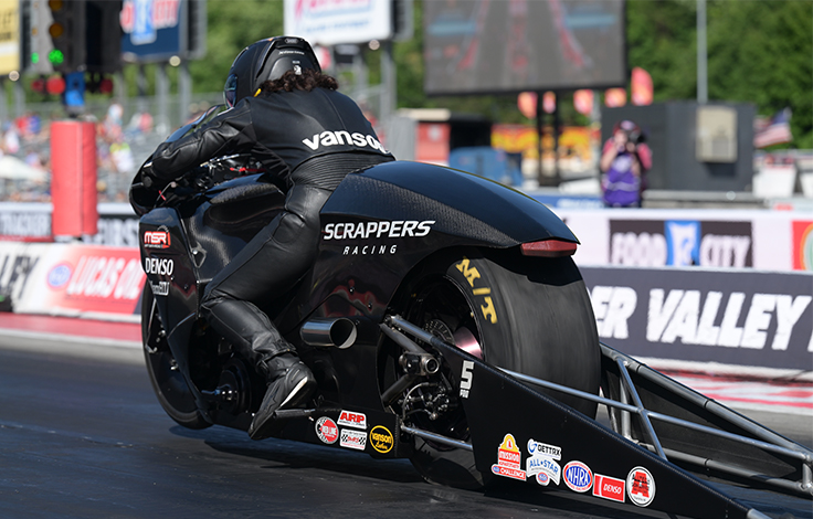 In the third qualifying session, Evaristo bounded up from the bottom half of the pack to No. 5 on a 6.865, 198.32 mph. First-round opponent Marc Ingwersen was a no-show, and Evaristo claimed her first round-win of the season, but she showed that she had earned the win light with a steady 6.871. Coming up against 2023 NHRA Rookie of the Year Chase Van Sant for round two, she stayed cool as her opponent went -.024 red, and the automatic win light sent her ahead to a semifinals meeting with charging Richard Gadson and his RevZilla/Mission Vance & Hines Suzuki.