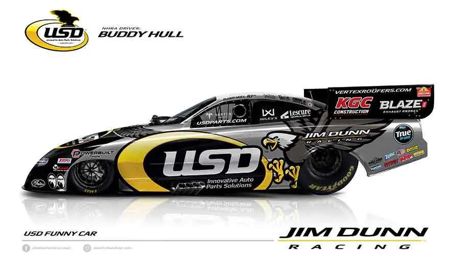 Continuing to highlight the diverse group of corporate supporters, Jim Dunn Racing and Funny Car driver Buddy Hull will be racing a USD branded nitro Funny Car at this weekend’s NHRA Arizona Nationals at Firebird Motorsports Park. With Hull behind the wheel as a rising star in the Funny Car ranks, the Jim Dunn entry will turn heads with the dynamic new-look design. Hull will be looking to make a move into the Funny Car top 10 at the third race of the NHRA Mission Foods Drag Racing Series season.