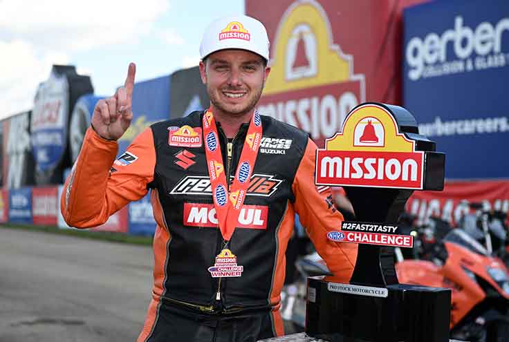 Defending Pro Stock Motorcycle Gaige Herrera stayed perfect in the Mission #2Fast2Tasty Challenge in 2024, winning for the third straight time with a run of 6.733 at 201.16 on his RevZilla/Mission Foods/Vance & Hines Suzuki. The victory came against teammate Richard Gadson, making it a win-win for the team, but Herrera has been nearly impossible to beat since last year. He'll look for yet another double-up weekend on Sunday, pleased with how the bike ran in the heat on Saturday at Route 66 Raceway.