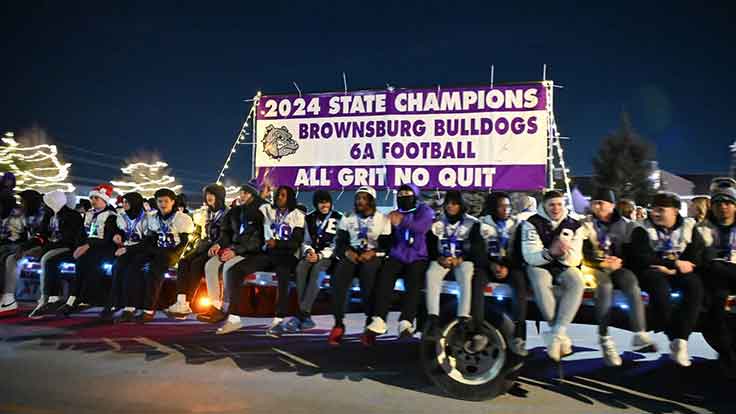 The nighttime parade, which is labeled as “Christmas Under the Stars,” follows a 1.2-mile route through downtown Brownsburg, not far from the gates of the iconic NHRA facility, which is home to the U.S. Nationals. The parade featured the NHRA North Central Division safety truck, which was part of a strong showing of first responder vehicles. Also featured was the Brownsburg High School football team, who recently won their first state championship since 1985.