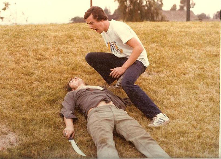 We also loved zombie films like Night of the Living Dead, so our third and final flick was a horror film called The Boys Get Radical, which we shot one weekend day on the campus at my college. We bought a better camera — actually bought it, used it, and returned it the next day — and became George A. Romero wannabes. We had no clue how to make people look like zombies, so our undead (who were coined “gorgies” for some reason) wore pillowcases over their heads. Somehow we spent a whole day carrying a real (unloaded) rifle around a college campus “shooting” one another, and didn’t get arrested.