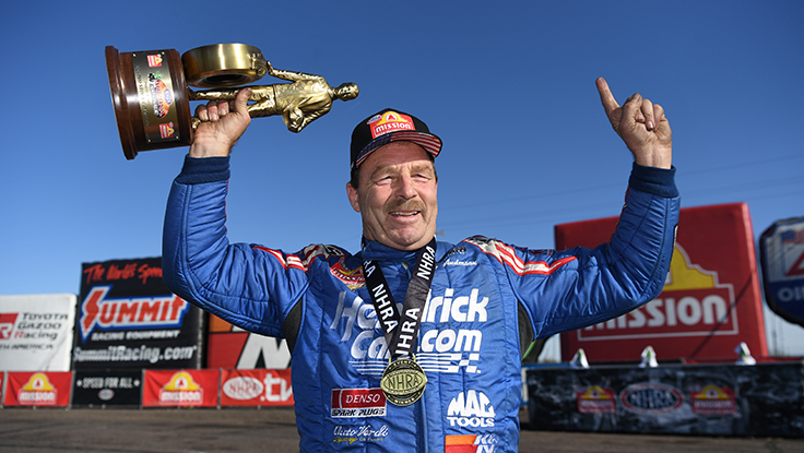 Greg Anderson may never again win 15 races in a season, as he did in 2004, but 27 years into his Pro Stock career, he remains a title threat. Anderson freely admits that at age 63, his days as a competitive driver are numbered, but this season, he appears to have discovered a fountain of youth. Seeking his sixth championship, Anderson is off to a great start with two wins and two semifinals in the first five events, culminating in a sparkling 12-3 record on race day. With his wins in Phoenix and Charlotte, Anderson has a slim 25-point lead over six-time and reigning world champ Erica Enders.