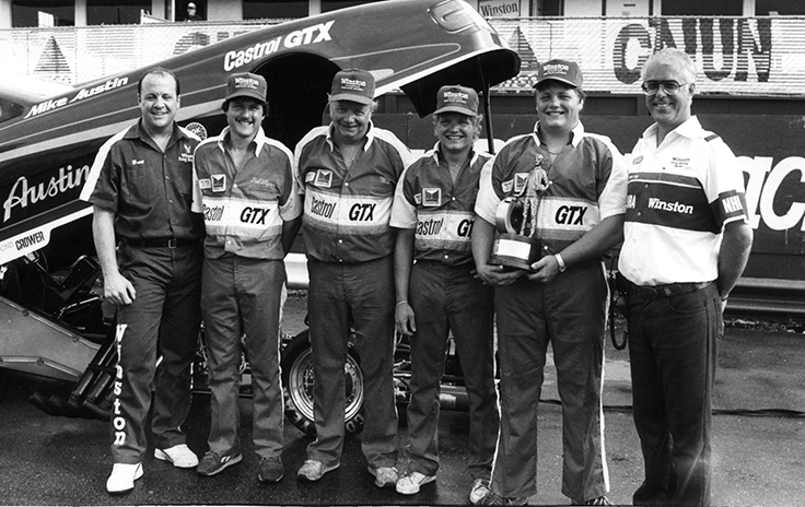 Pat Austin won his first of 75 NHRA national event titles at the 1986 Cajun Nationals. That's a very young Rob Flynn, second from left, on the team.