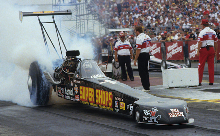 Don Garlits then won Top Fuel back-to-back in 1985 and ’86, the first with his conventional car and the second in his Swamp Rat XXX streamliner. Garlits won the 1986 final over Gary Ormsby’s Castrol GTX streamliner in the first (and only) all-streamliner final. (As we learned here, the modern-day Top Fuel streamliner phase lasted only about two seasons.)