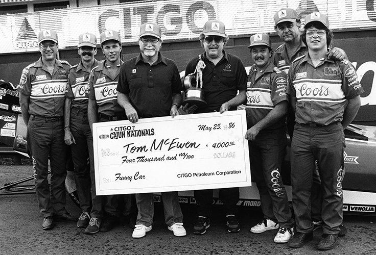 Tom "the Mongoose" McEwen won Funny Car at the 1986 Cajuns with crew chief Bill Schultz, far left, and a very young Jimmy Prock, far right, on the Coors team.