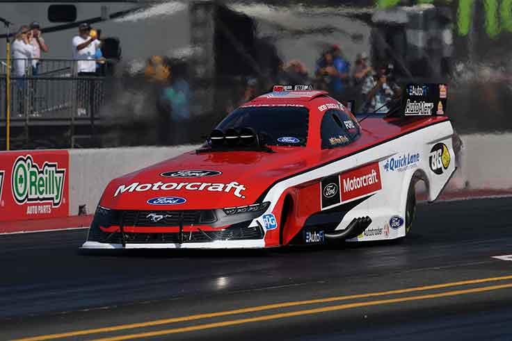 Bob Tasca III’s stout 3.893-second run from Friday night held up to take the top spot in Funny Car qualifying, but just barely. Matt Hagan was able to tie Tasca’s elapsed time, but Hagan could not match Tasca’s near-record 338.43 mph speed.